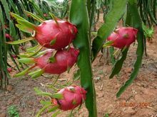 果实[1] ,呈椭圆形,直径10-12厘米,外观为红色或黄色,有绿色圆角三角形的叶状体,白色、红色或黄色果肉,具有黑色种子的水果。